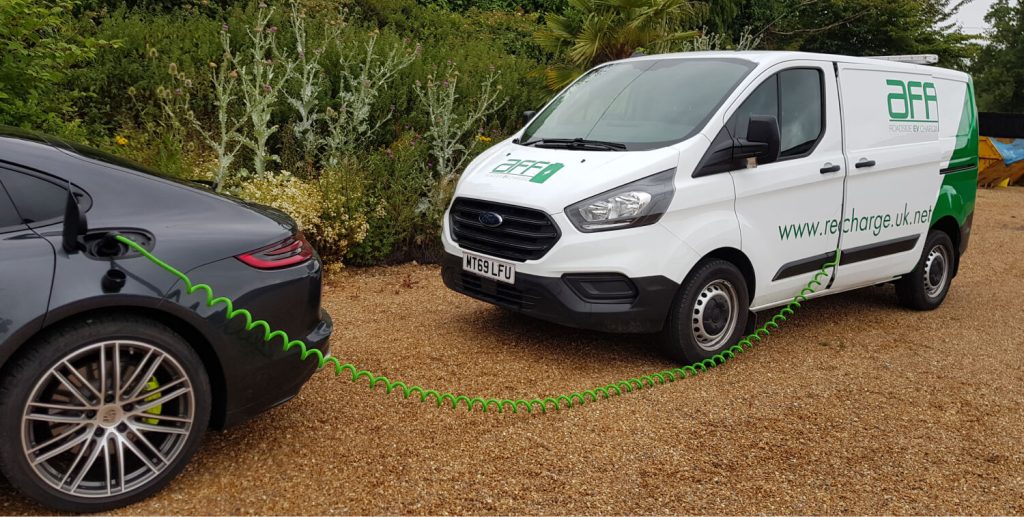 AFF are now able to provide a national 24 hour mobile fast charging service for your EV. As the only company who are able to provide charging at up to 13kw/hour, a 30 minute charge will normally deliver a 20-25 mile range.